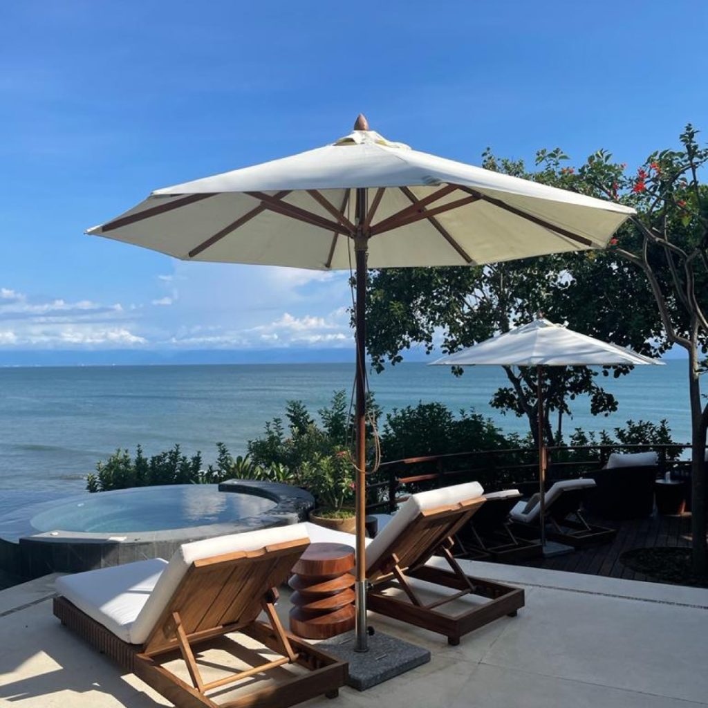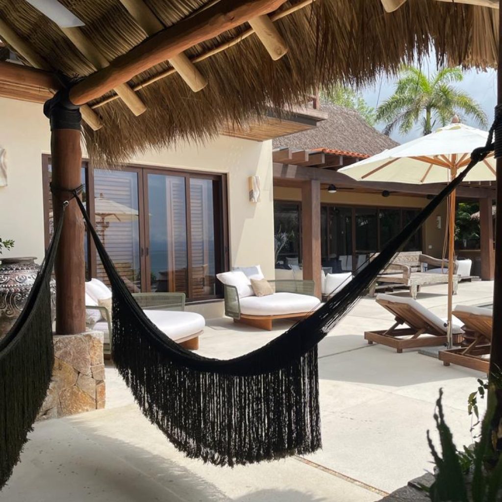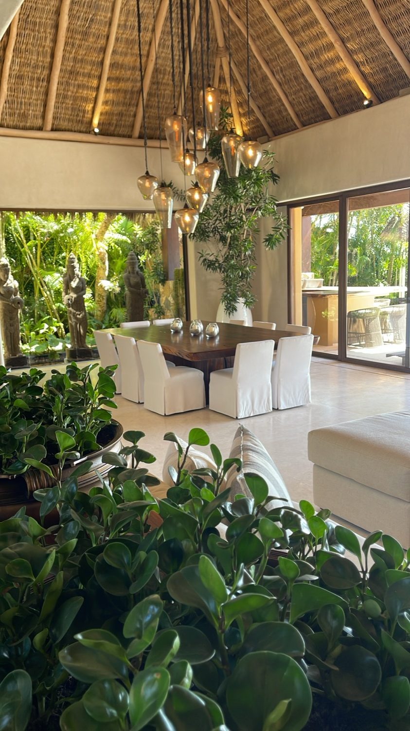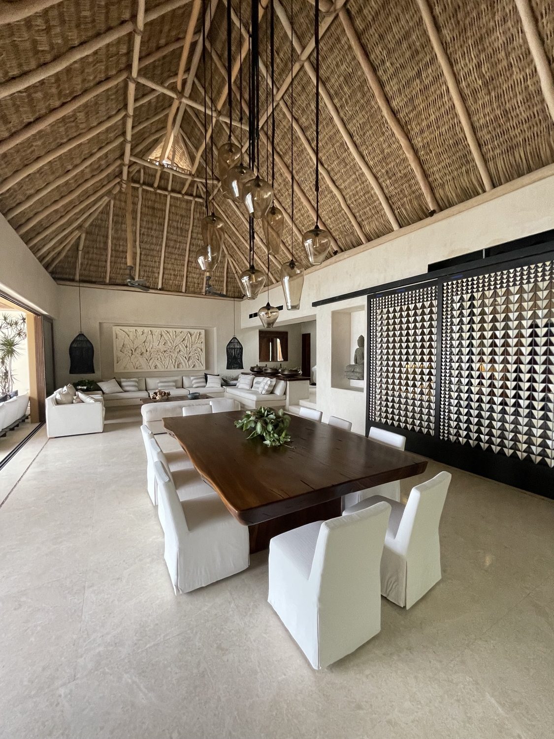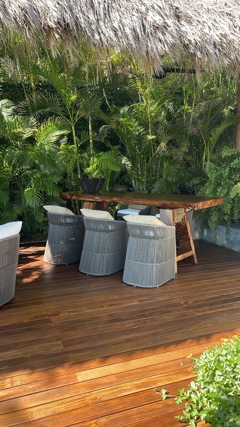 El mobiliario exterior, con fibras tejidas y textiles resistentes, está pensado para el descanso y la convivencia, mientras que las palapas de palma y los detalles en piedra refuerzan la atmósfera relajada y sofisticada.
