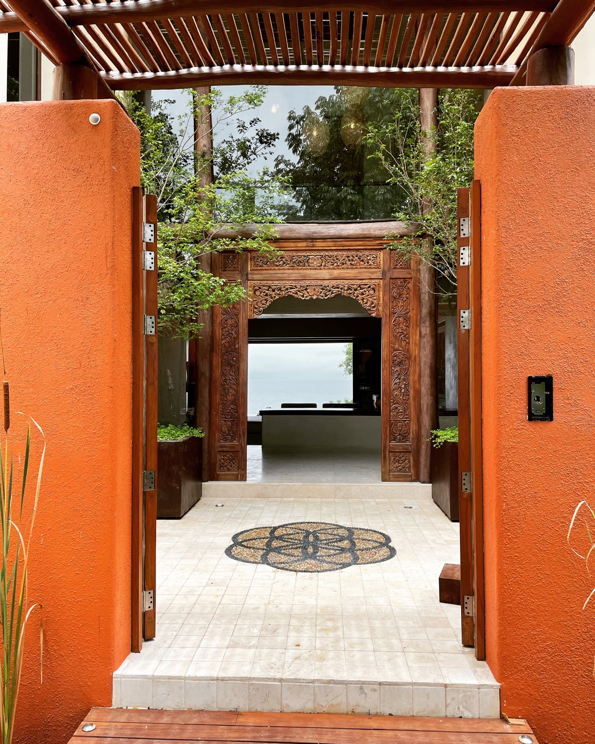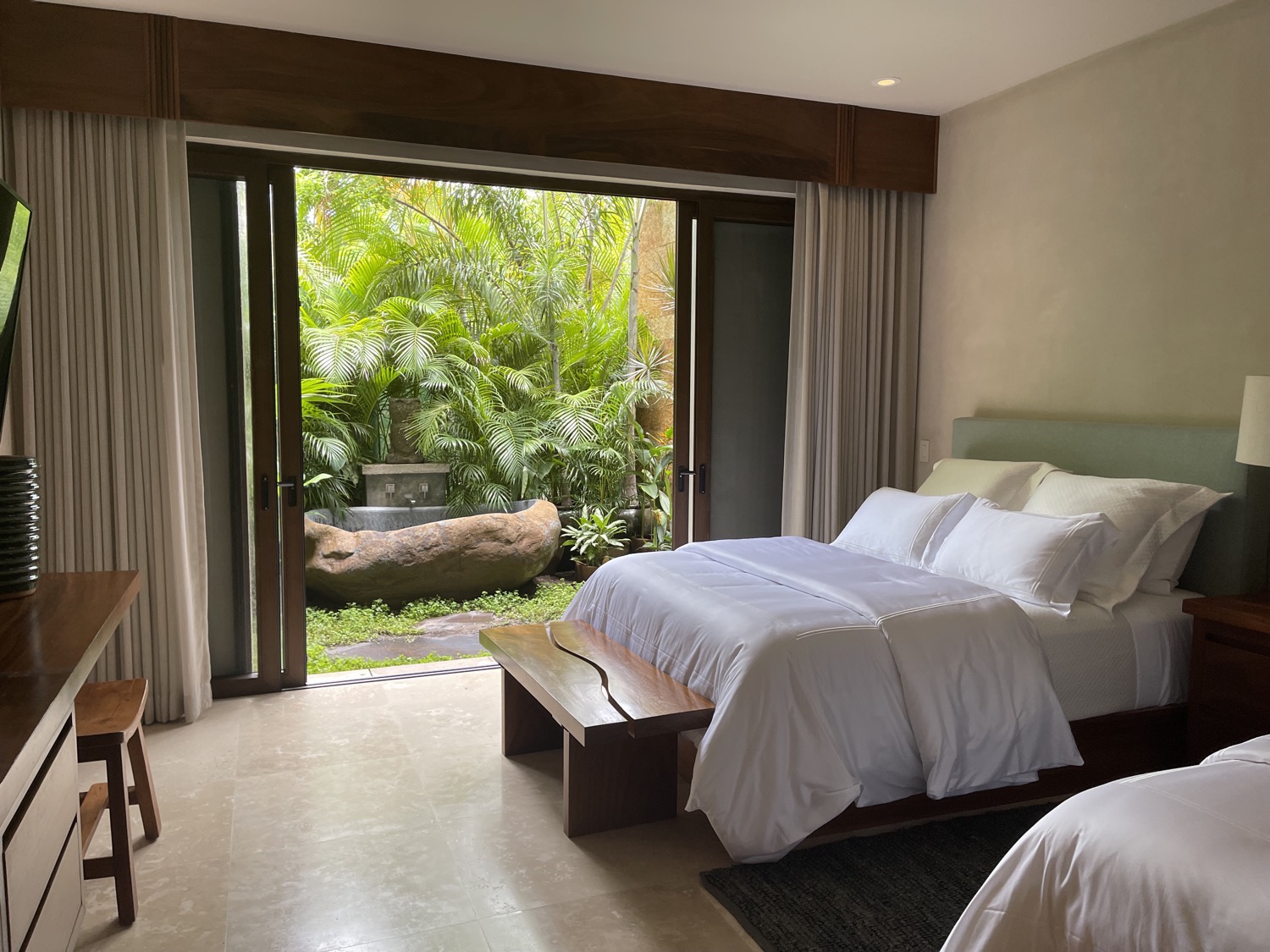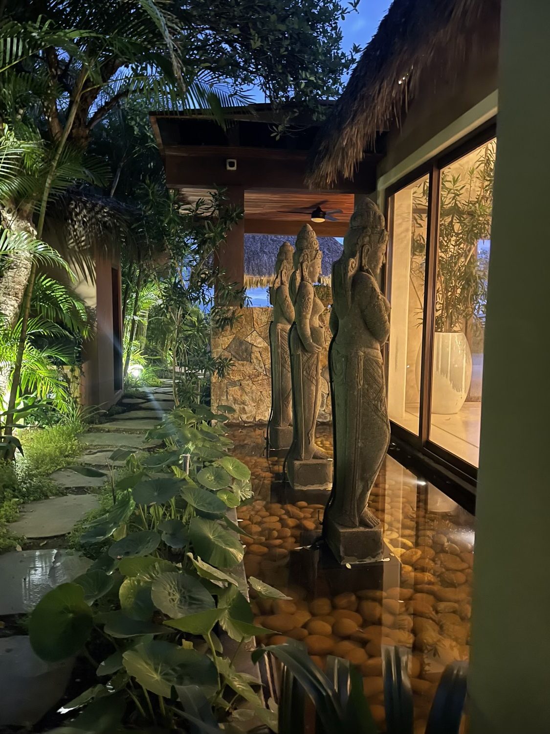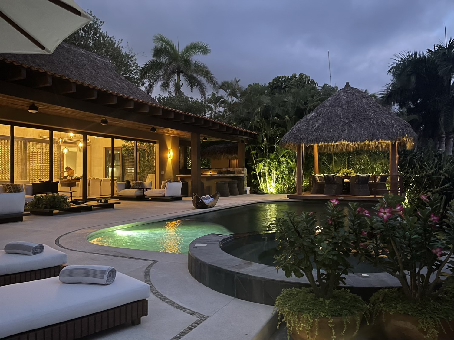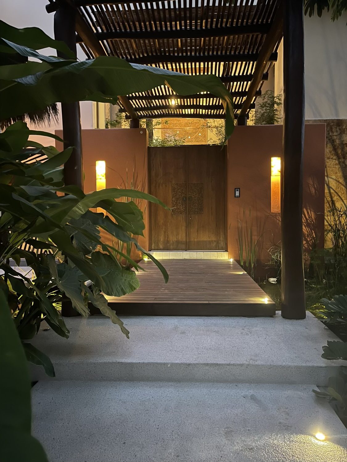 El mobiliario exterior, con fibras tejidas y textiles resistentes, está pensado para el descanso y la convivencia, mientras que las palapas de palma y los detalles en piedra refuerzan la atmósfera relajada y sofisticada.