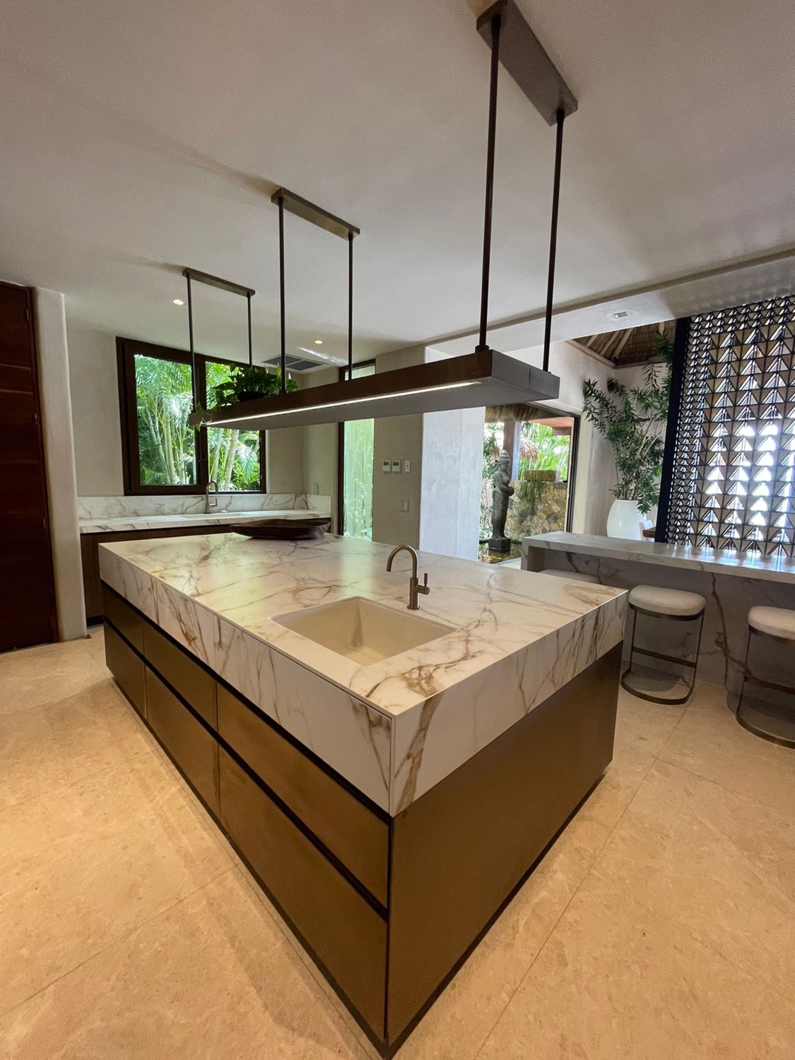 La cocina, con una impresionante isla de mármol veteado y gabinetes en tonos bronce y madera, se convierte en el corazón social de la casa. Los amplios ventanales permiten la entrada de luz natural y ofrecen vistas espectaculares al mar, integrando el interior con el exterior. La vegetación, presente tanto en macetas como en el paisaje circundante, añade frescura y vitalidad a cada rincón.