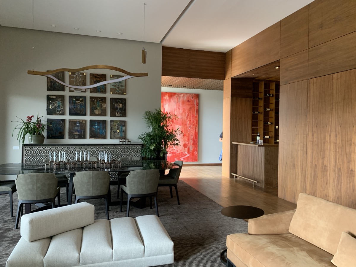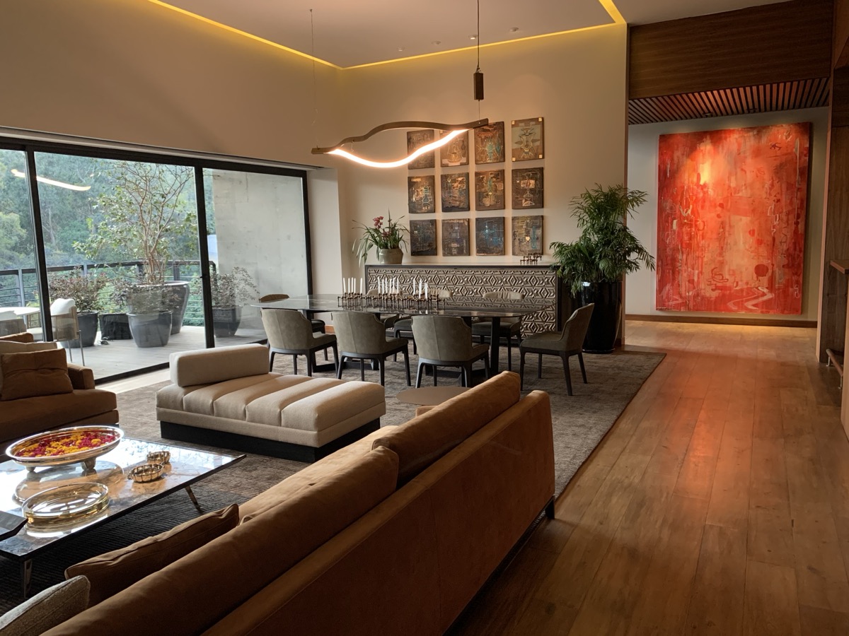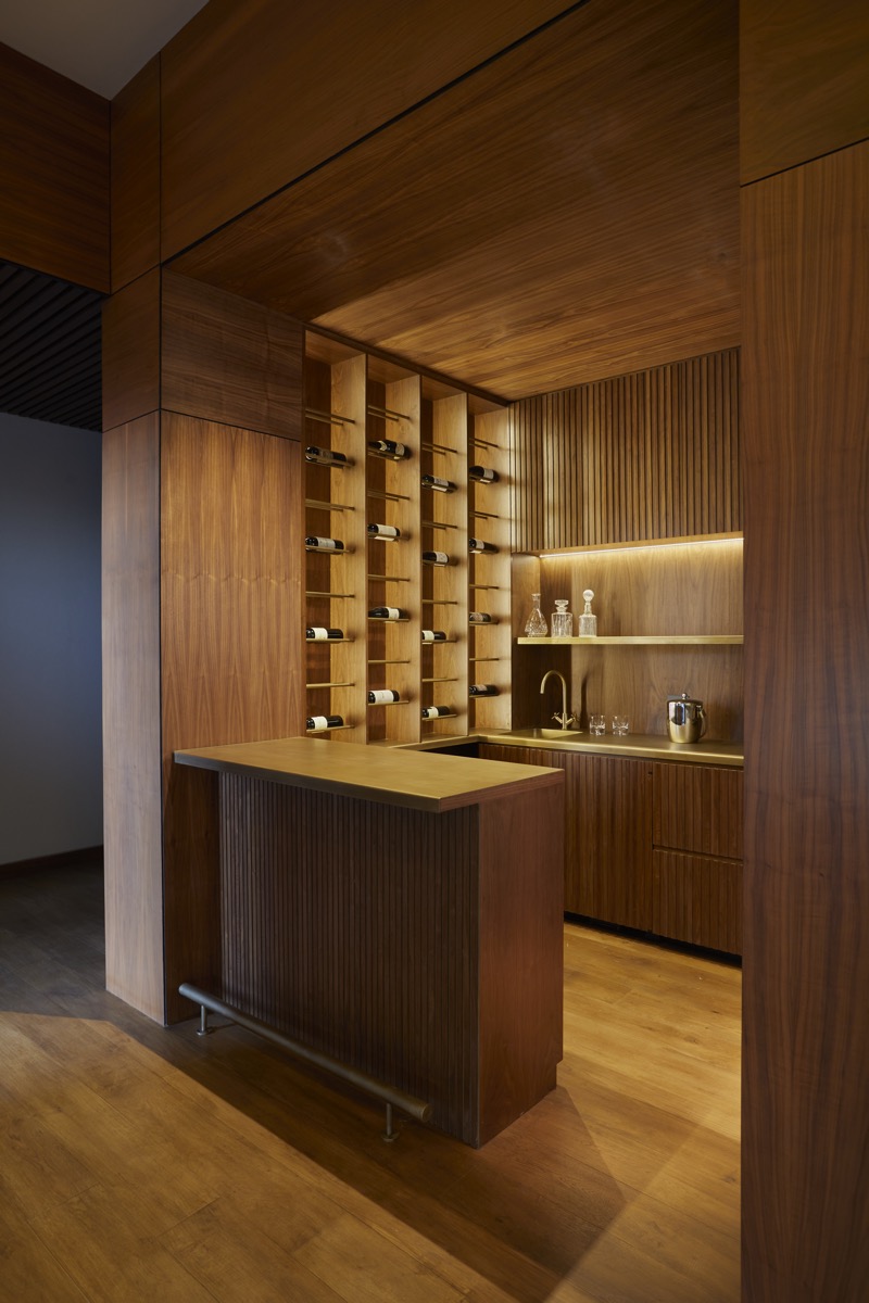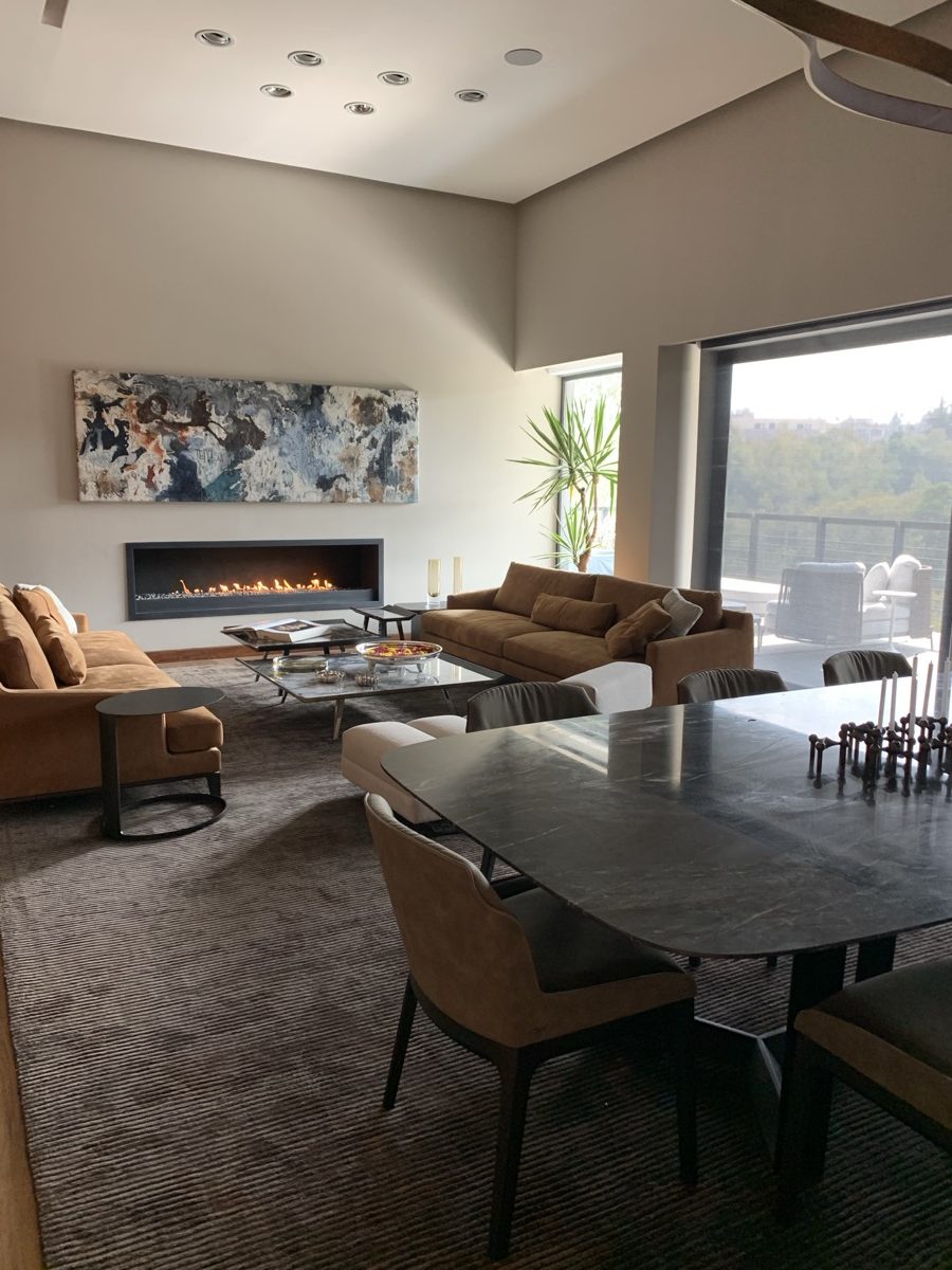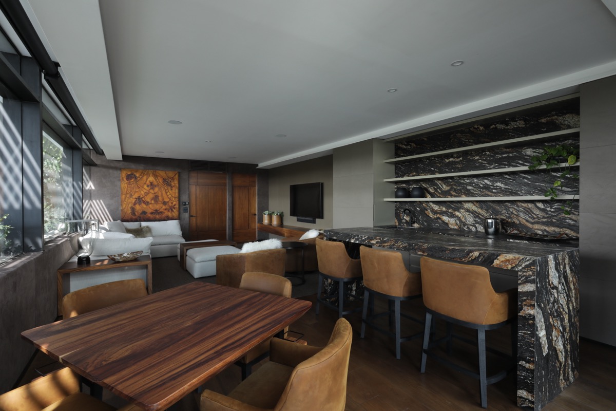 Este proyecto de interiorismo destaca por su elegancia contemporánea y una fuerte conexión con la naturaleza. Se caracteriza por el uso de materiales orgánicos y lujosos: madera en pisos y mobiliario, y una imponente piedra veteada que protagoniza la barra y el muro de la cocina. La paleta de colores es cálida y sofisticada, dominada por tonos tierra, cremas y acentos en cuero.
