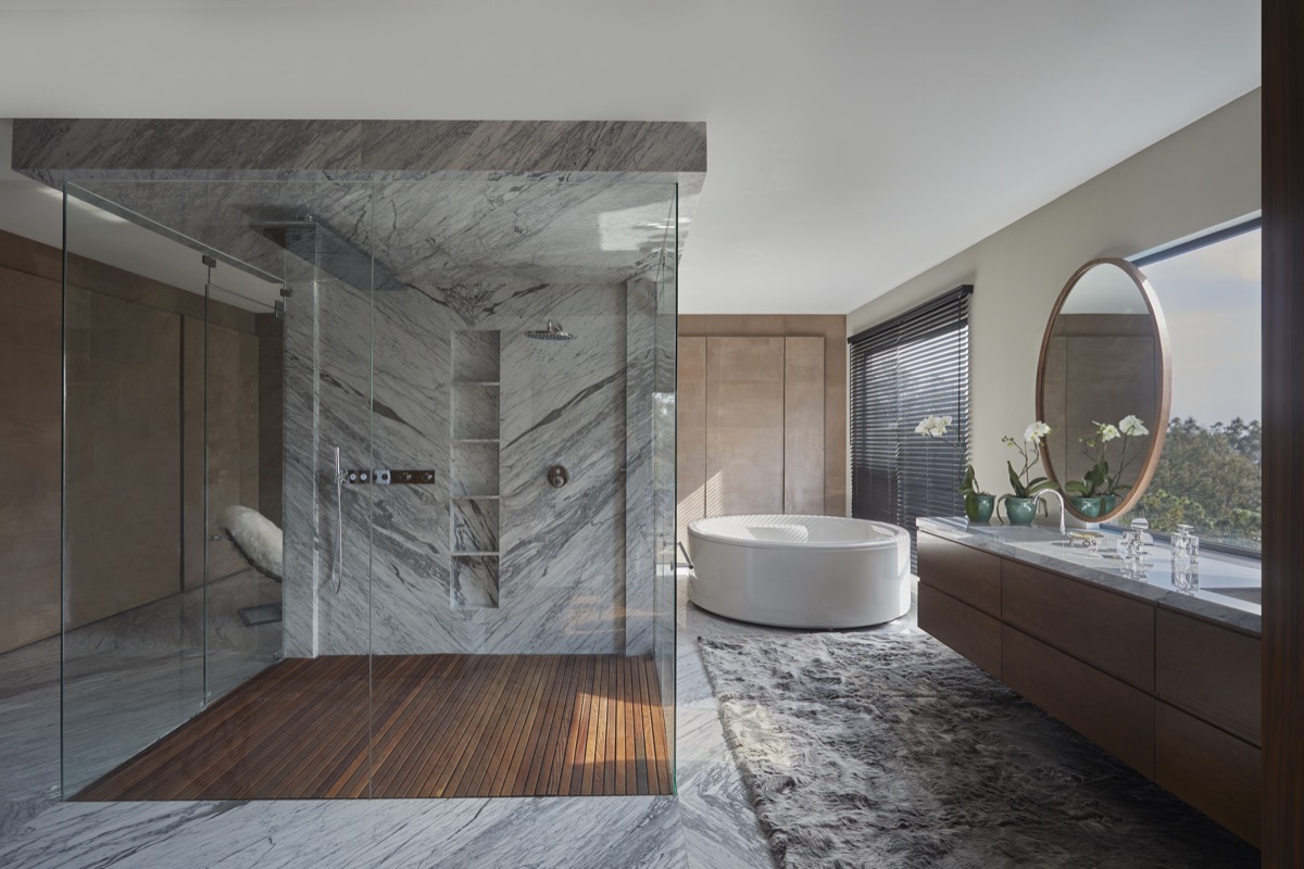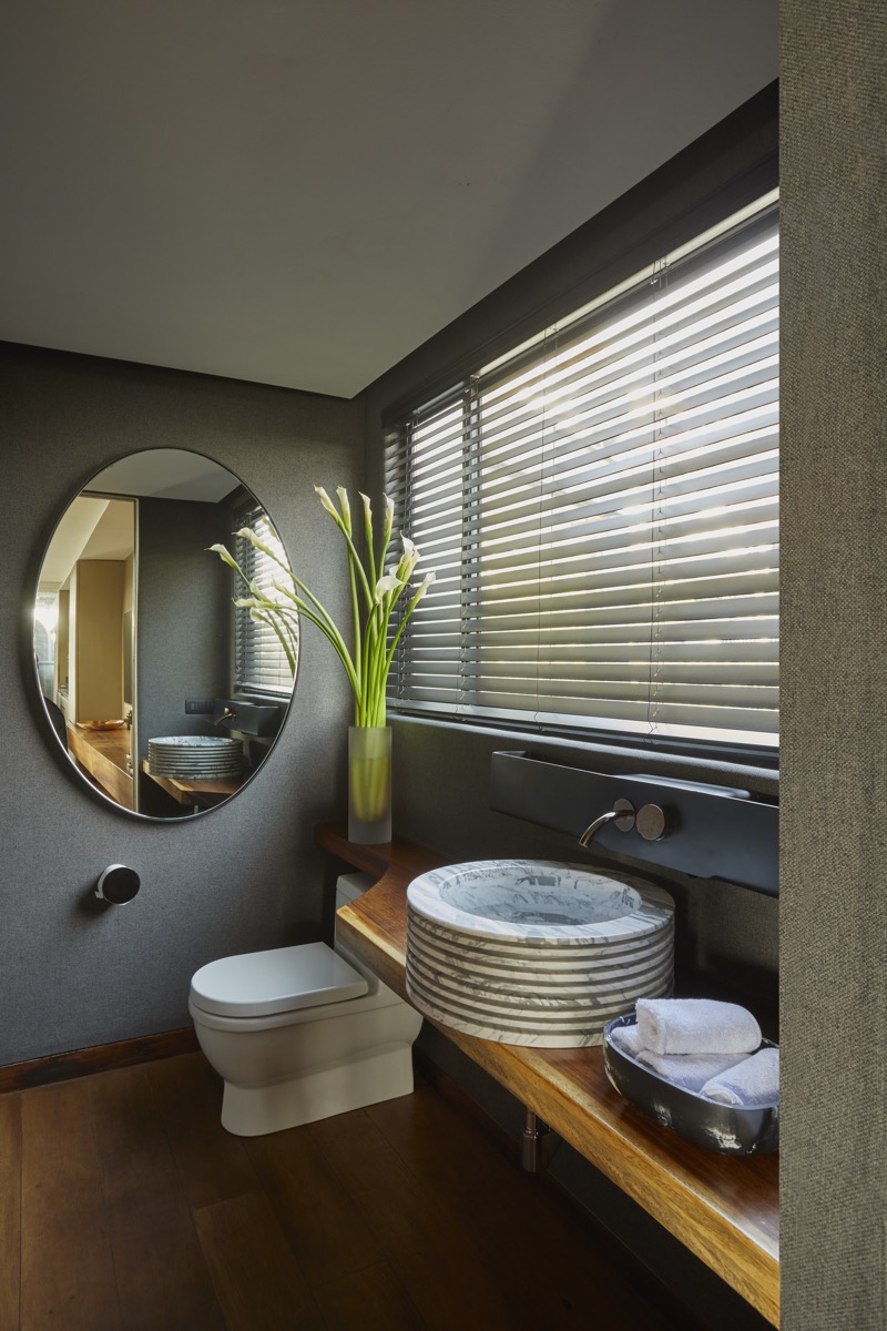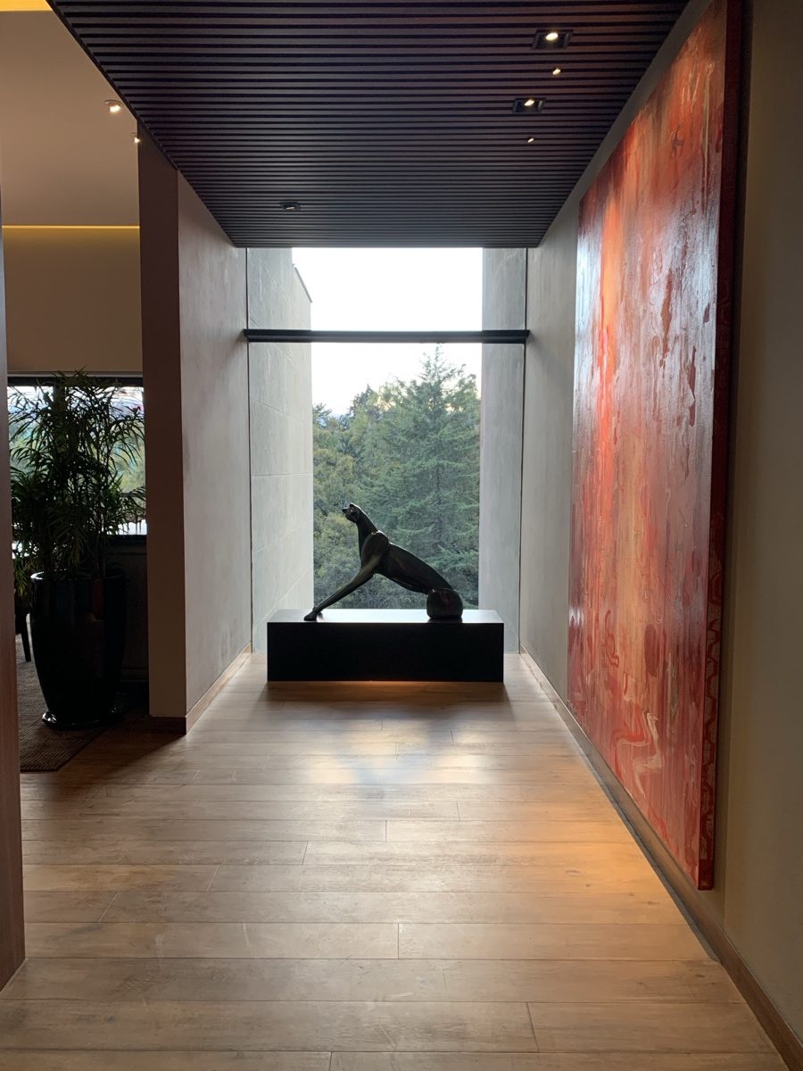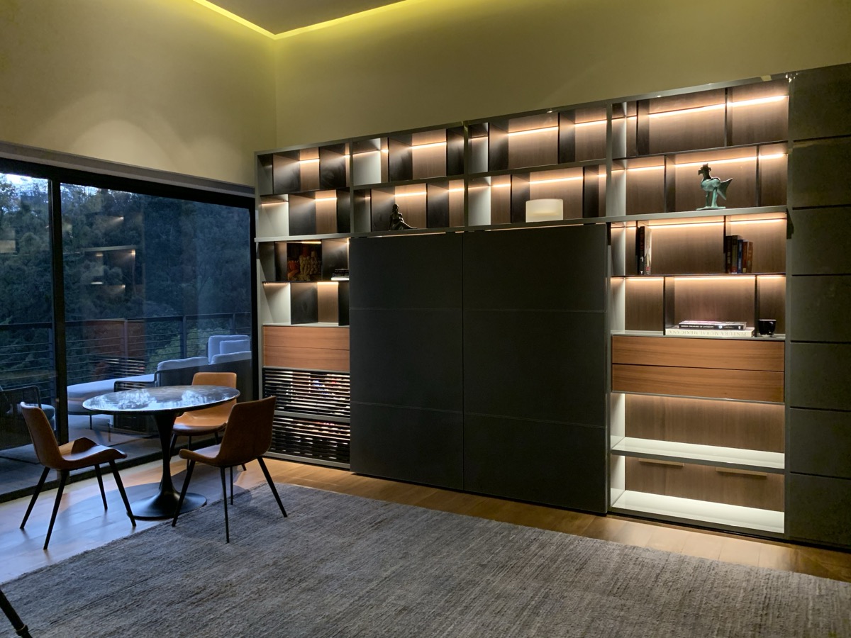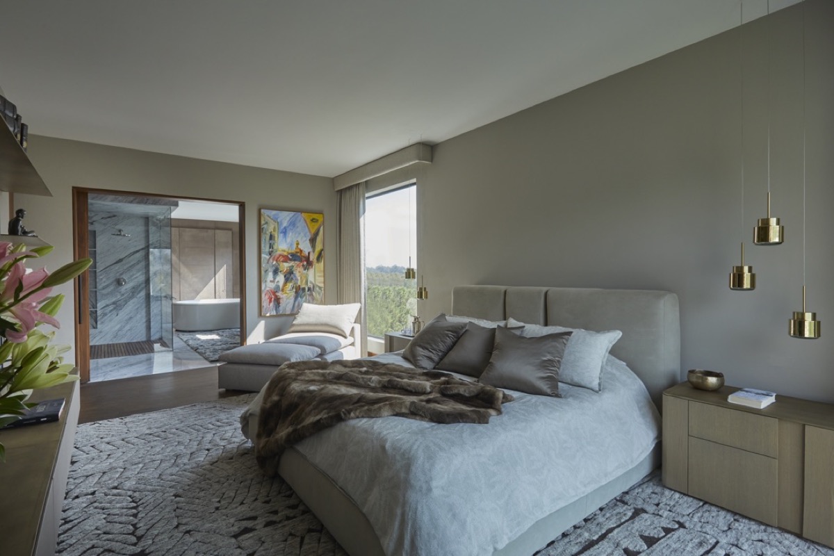 Este proyecto de interiorismo destaca por su elegancia contemporánea y una fuerte conexión con la naturaleza. Se caracteriza por el uso de materiales orgánicos y lujosos: madera en pisos y mobiliario, y una imponente piedra veteada que protagoniza la barra y el muro de la cocina. La paleta de colores es cálida y sofisticada, dominada por tonos tierra, cremas y acentos en cuero.