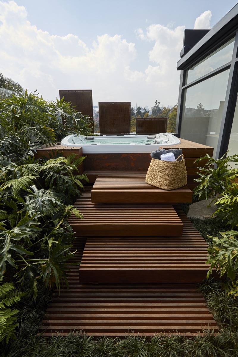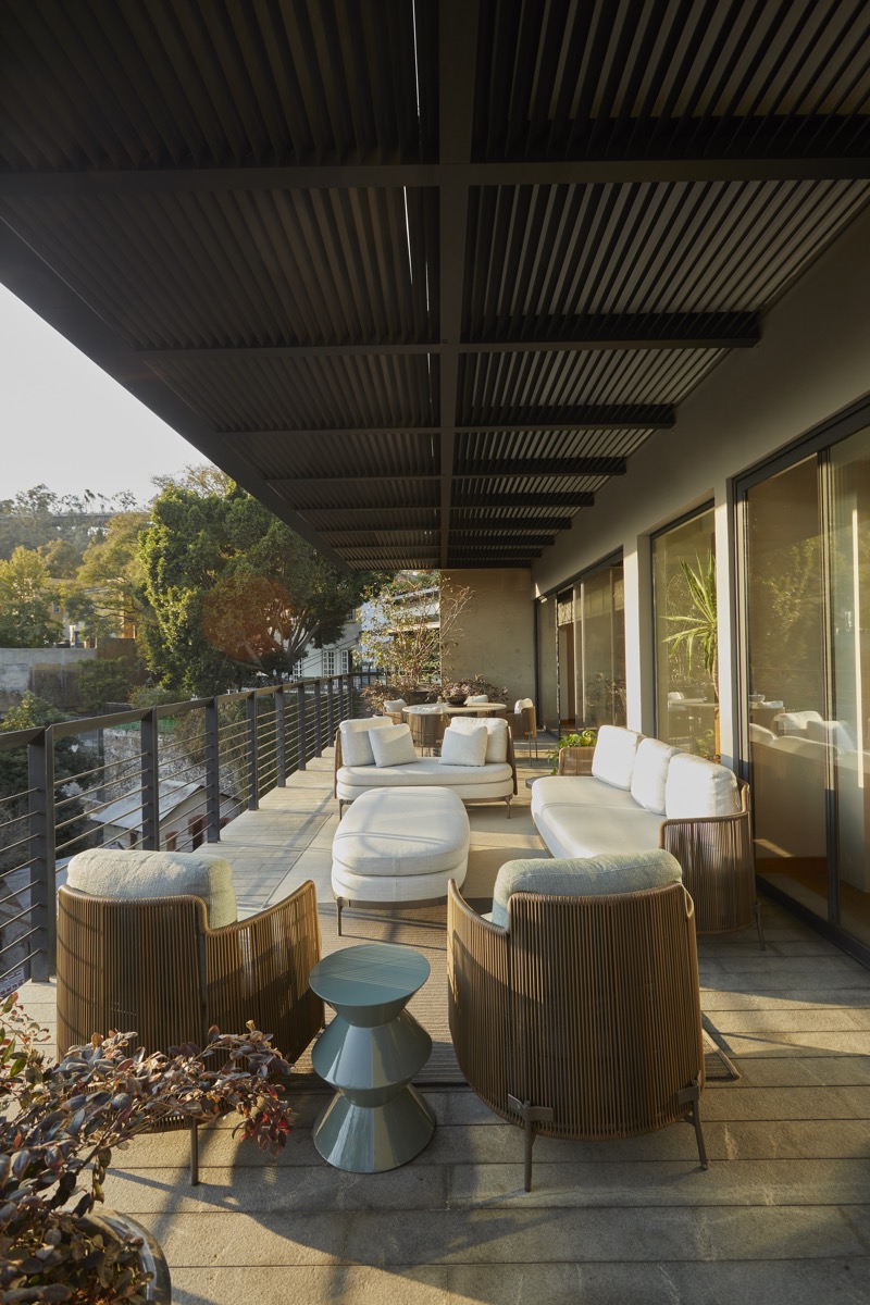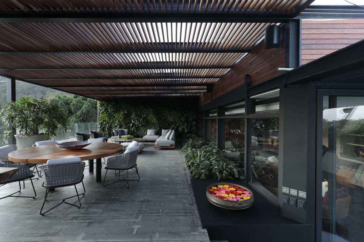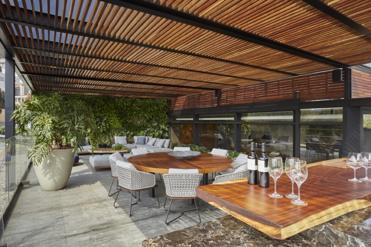 El diseño maximiza la luz natural y difumina las barreras entre el interior y el exterior, integrando a la perfección una amplia terraza con pérgola de madera y un exuberante jardín vertical, creando un ambiente de confort refinado y sereno.