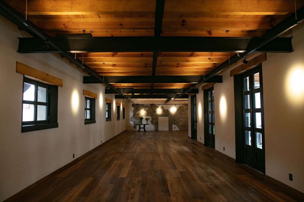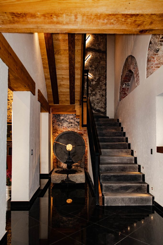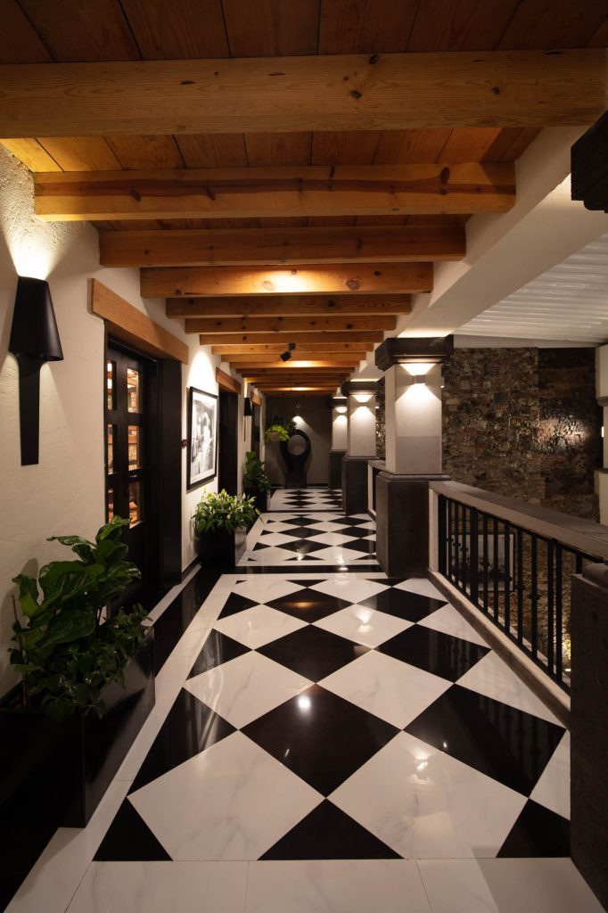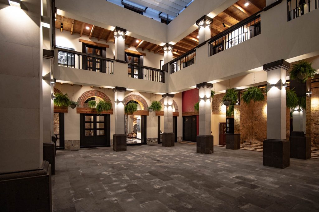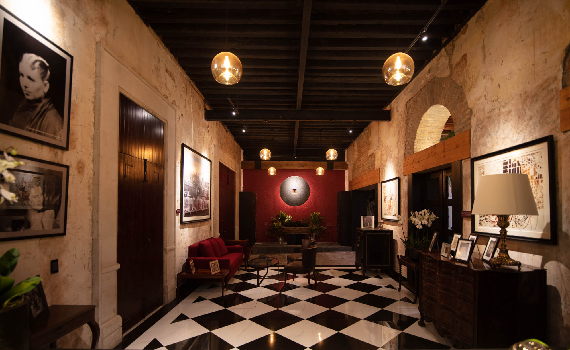 Este espacio interior fusiona magistralmente elementos del diseño colonial con acentos contemporáneos, en un homenaje a la historia y la cultura mexicana. Las paredes muestran el paso del tiempo con su acabado rústico y texturizado, evocando la solidez de una casona antigua, mientras que las fotografías históricas de México refuerzan la narrativa visual del lugar. La escultura circular al fondo, de origen azteca y hallada durante las obras en el sitio, se convierte en el punto focal de la sala, integrando el pasado prehispánico con el presente arquitectónico.