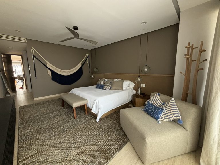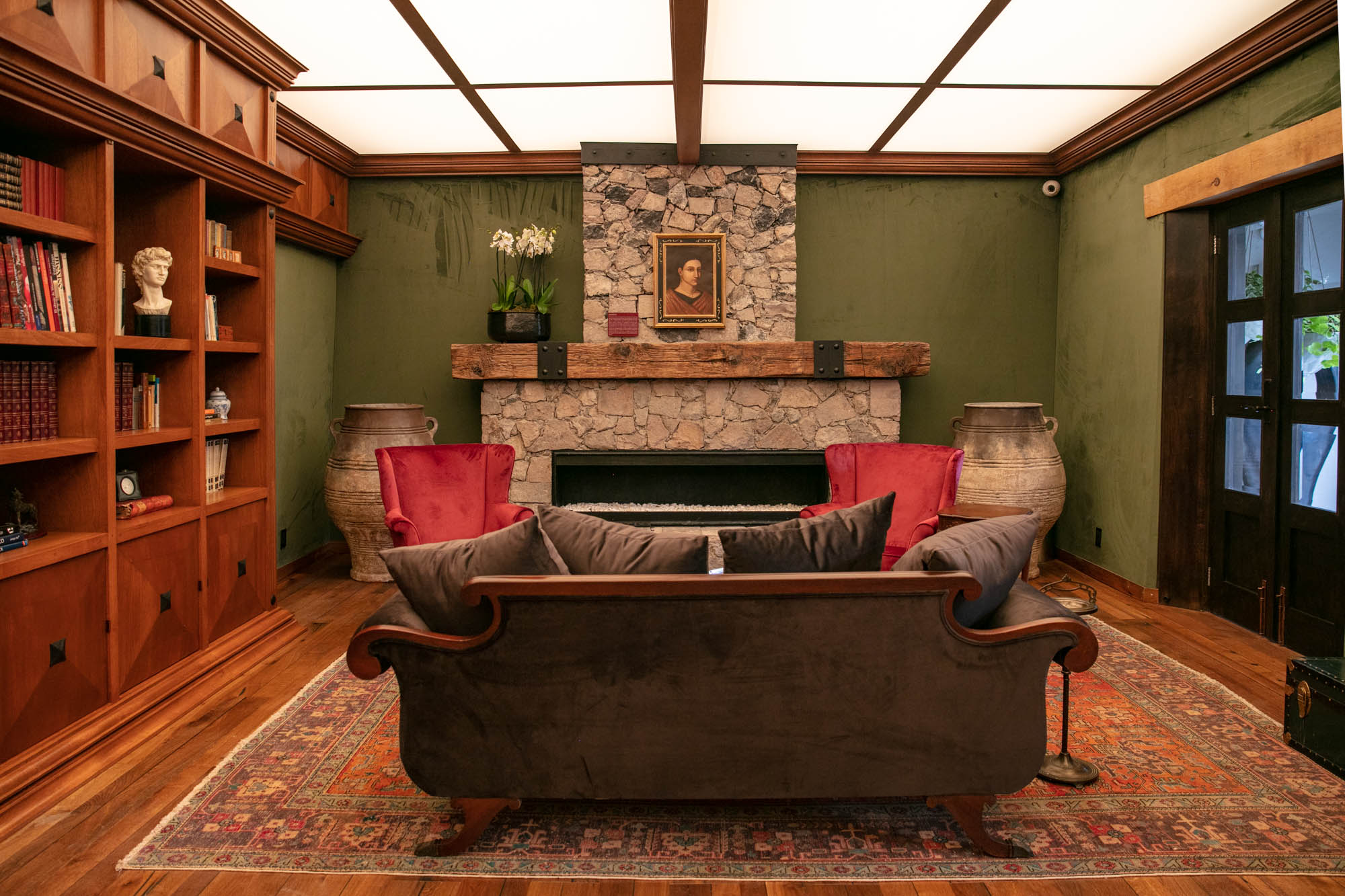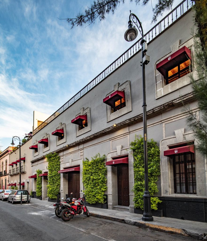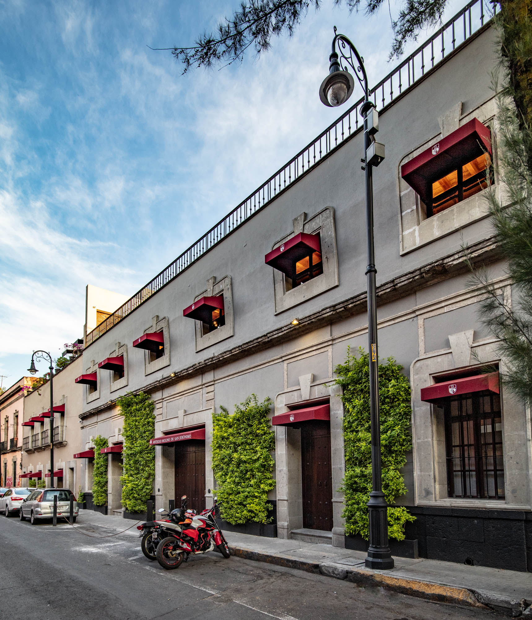 Este espacio interior fusiona magistralmente elementos del diseño colonial con acentos contemporáneos, en un homenaje a la historia y la cultura mexicana. Las paredes muestran el paso del tiempo con su acabado rústico y texturizado, evocando la solidez de una casona antigua, mientras que las fotografías históricas de México refuerzan la narrativa visual del lugar. La escultura circular al fondo, de origen azteca y hallada durante las obras en el sitio, se convierte en el punto focal de la sala, integrando el pasado prehispánico con el presente arquitectónico.